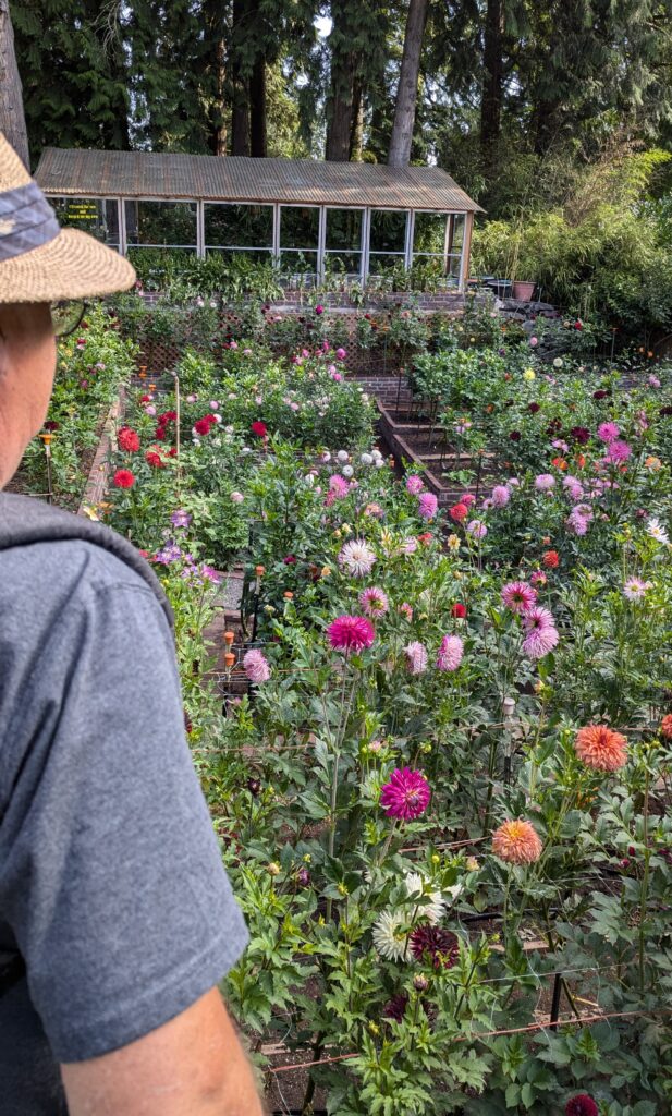In an effort to share dahlias with his local community, he struck up a deal with the Brightwater Treatment plant down the road from his home. He would put in and maintain dahlia beds for them in exchange for free compost and the ability to put on “How to grow Dahlias classes” for the community. During these classes would give away bundles of tubers and cuttings to the participants along with growing information and offers to help them as they needed. He encouraged those in the classes to join a local dahlia club.